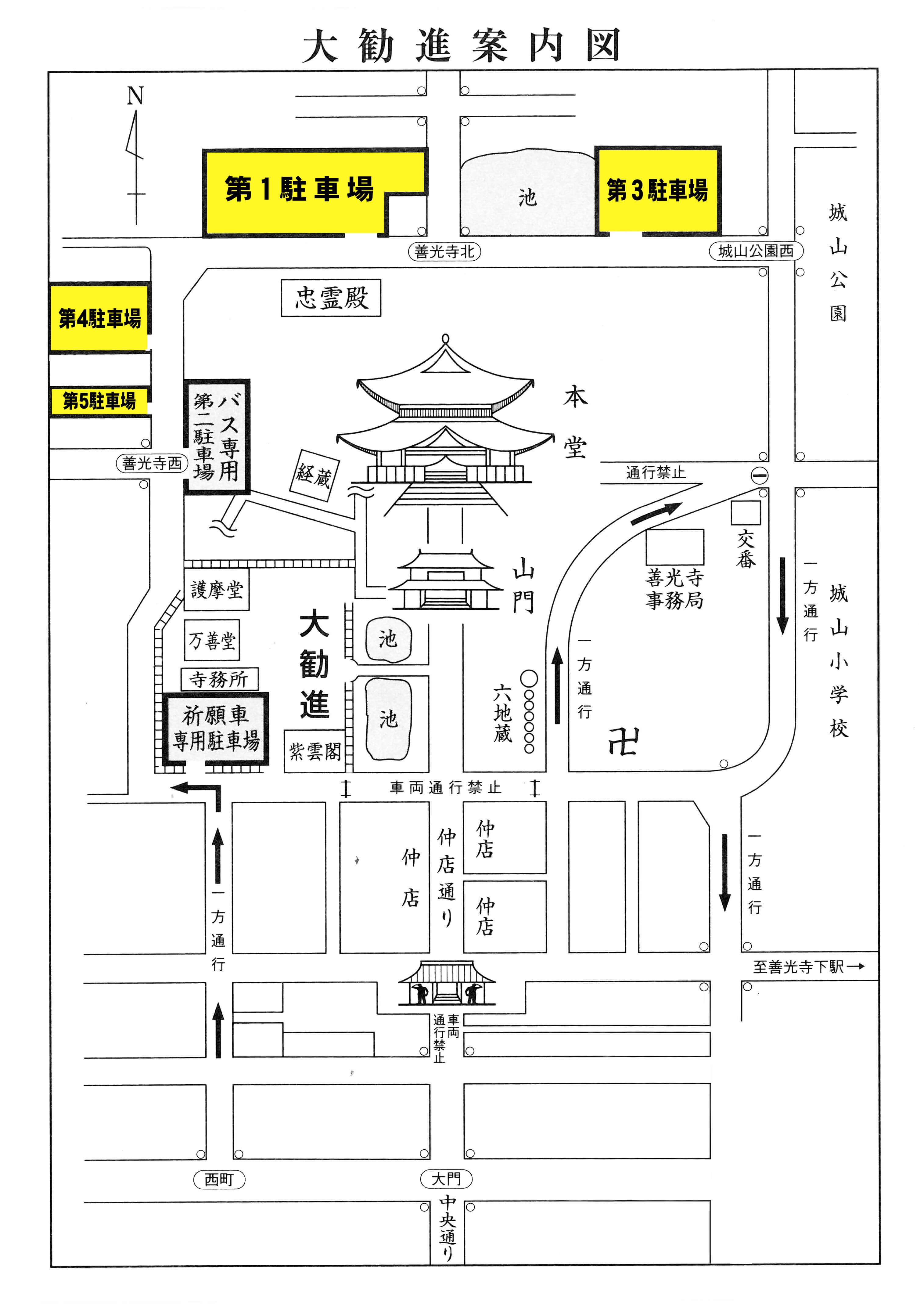 上記地図の黄色で囲った善光寺第1・3・4・5駐車場をご利用ください。
